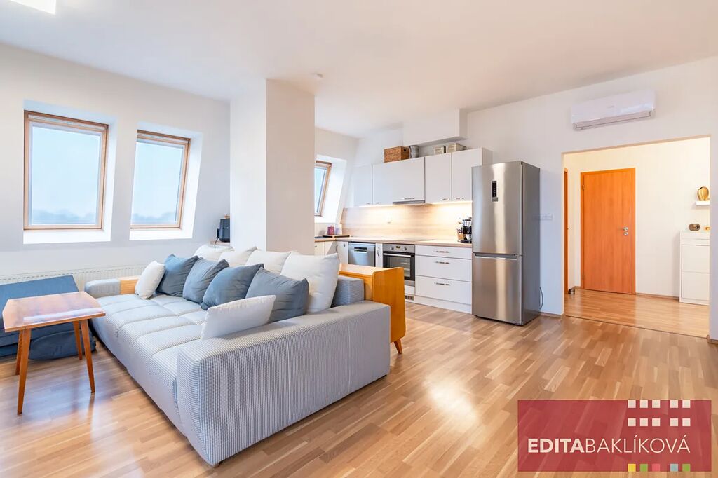 Nabízíme k pronájmu světlý podkrovní byt s částečně krytou terasou a dvěma garážovými parkovacími místy, na skvělé adrese.