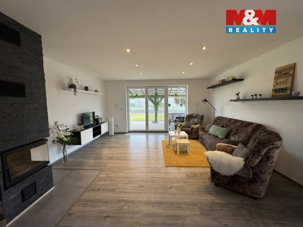 Srdcem domu je velkorysý obývací pokoj s kuchyňským koutem, krbem, klimatizací a přímým vstupem na terasu. Dispozice domu dále zahrnuje tři samostatné pokoje, koupelnu, WC, technickou místnost a garáž.