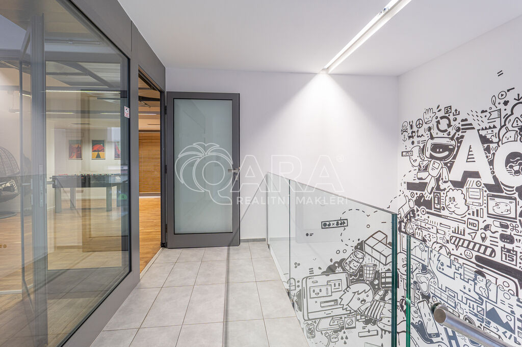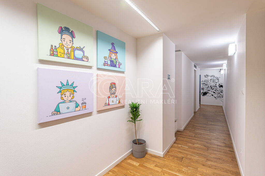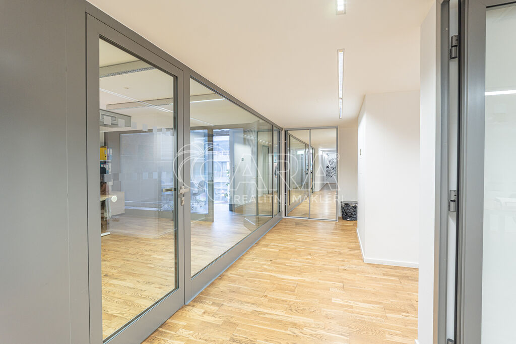 Prostor o celkové rozloze kanceláří 335 m² je plně klimatizovaný. Dispozice nabízí dvě větší otevřené místnosti, dvě místnosti oddělené skleněnou stěnou, přičemž jedna z nich má vstup na terasu o velikosti 17 m², samostatnou uzavřenou místnost, zasedací místnost a prostor pro recepci či posezení návštěv. Zázemí zahrnuje kuchyňku, jídelní kout, 2x moderní sociální zařízení se sprchou, serverovnu a úklidovou místnost.