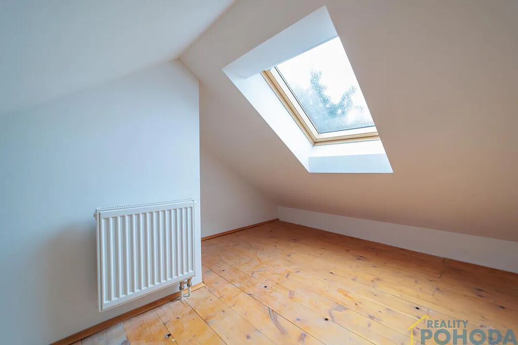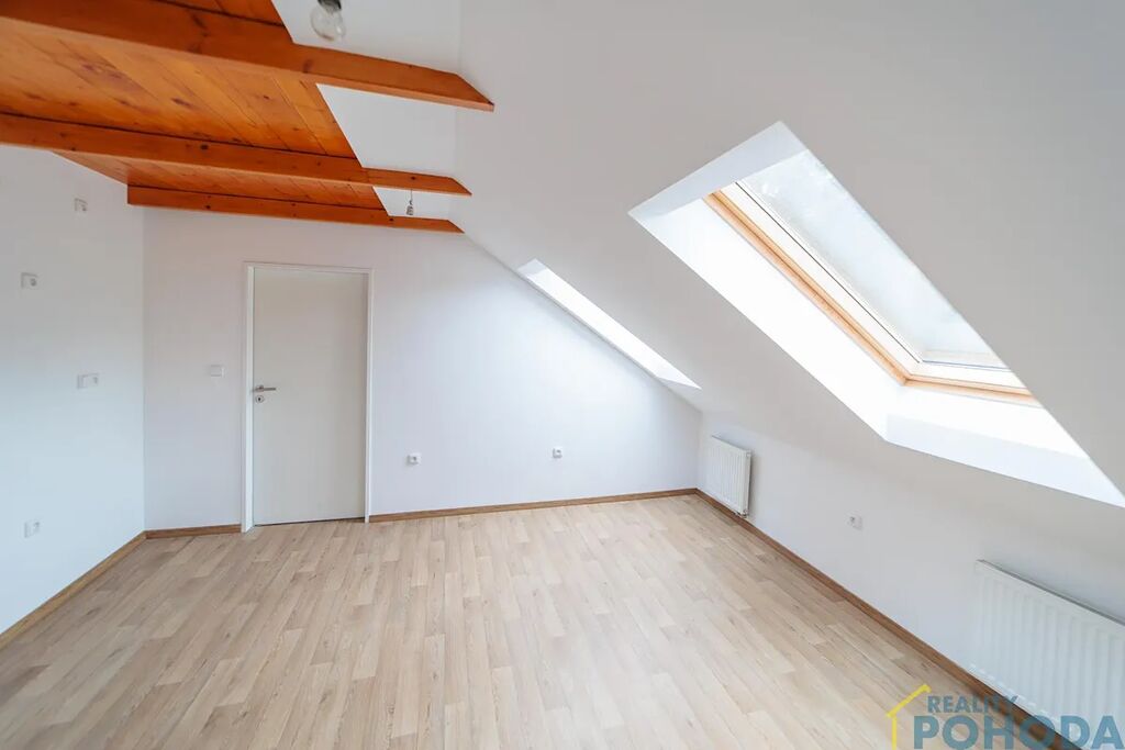 Dále je zde koupelna společně s toaletou, vanou, praktickou nikou na odkládání koupelnových přípravků a střešním oknem, díky němuž je i tato místnost krásně prosvětlená. Součástí koupelny je také žebříkový radiátor, který se postará o příjemné teplo a komfort po vaší každé koupeli. Zajímavým prvkem jsou dřevěné stropy a trámy ve všech místnostech. Podlahy v přírodním dekoru podtrhují klidný charakter bytu. Internet je přiveden kabelem spol. Cetin. Samozřejmostí jsou vlastní měřidla energií. Je zde možnost zakoupení vlastního parkovacího místa před domem.