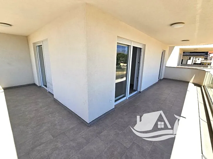 Dispozice bytu zahrnuje chodbu, koupelnu, obývací pokoj s kuchyní a jídelnou, 2 ložnice a terasu o velikosti 20 m², ideální pro relaxaci a vychutnávání si výhledů na moře.