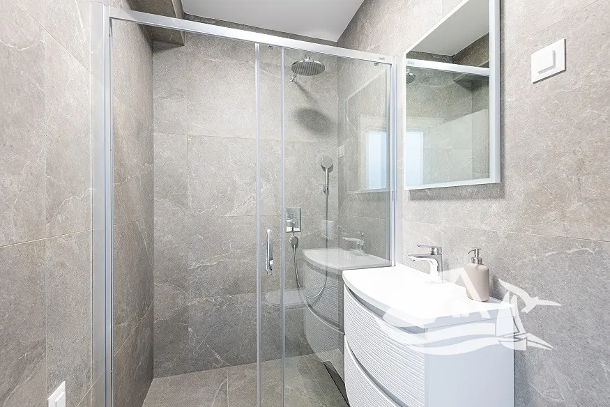 Byt je navržen s důrazem na maximální pohodlí, energetickou efektivitu a nadstandardní vybavení. V rámci stavby byly použity pouze nejkvalitnější materiály, což je patrné nejen z konstrukčního řešení, ale i z finálních povrchových úprav a detailů v interiéru. Dispozice bytu zahrnuje otevřený obytný prostor s kuchyní a jídelnou, ze kterého vede schodiště do horní galerie – prostoru vhodného jako ložnice, pracovna nebo relaxační zóna podle přání nového majitele. Součástí bytu je rovněž terasa s vířivkou (jacuzzi), která poskytuje ničím nerušený výhled na moře a zároveň nabízí výjimečné soukromí a prostor pro odpočinek.