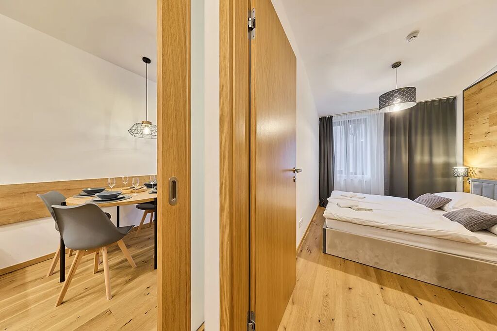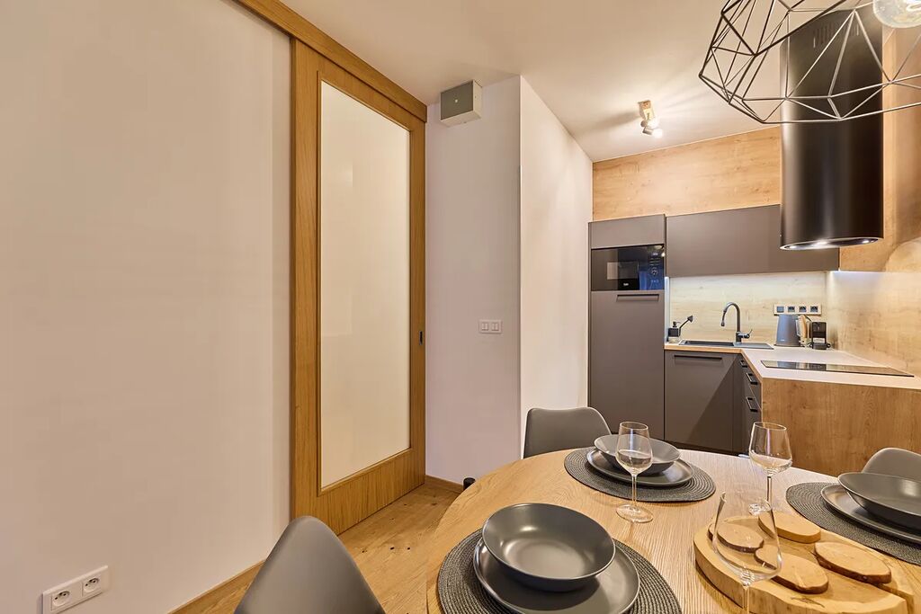 Apartmán je řešen moderním stylem s důrazem na design. Dispozice apartmánu je 2+kk s celkovou podlahovou plochou (vč. Bike boxu 1,90m2) 43,20m2. Vstupní předsíň je vybavena prostornou vestavěnou skříní, poskytující dostatek úložného prostoru. Po pravé straně je umístěna moderní koupelna se sprchovým koutem a WC. Následuje ložnice s manželskou postelí pro klidný spánek a komodou. Za posuvnými dveřmi je umístěna obývací místnost s rozkládací sedačkou a kuchyňským koutem s jídelnou. Kuchyňská linka je zařízena spotřebiči, ale také nádobím. Můžete tedy přijet a hned si apartmán užívat.