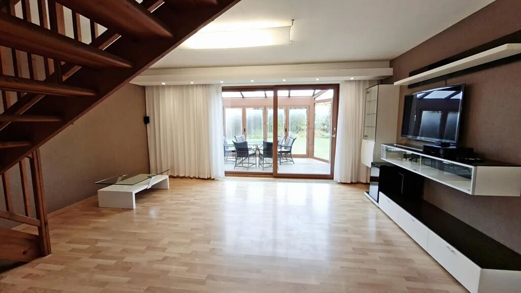 V přízemí domu je předsíň, samostatná toaleta, kompletně vybavená kuchyň 15 m2, obývací pokoj 42 m2 s přístupem do zahrady přes uzavřenou zimní zahradu. Ze zadní části domu také můžete vejít do komory 7 m2 a do sauny s toaletou a sprchovým koutem. Z ulice je další vstup do místnosti pro ukládání sportovního vybavení.