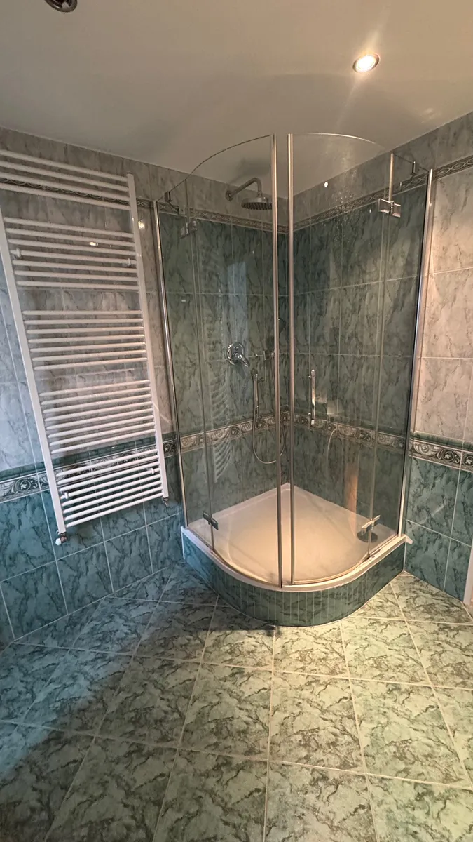 Kompletně vybavená koupelna s moderním sprchovým koutem, automatickou pračkou a dvěma žebříky na sušení ručníků. Vše v perfektním stavu.