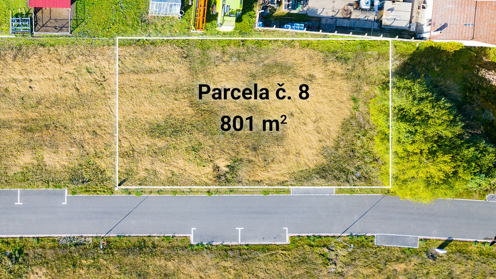 Stavební pozemek 803 m² pro stavbu RD včetně připraveného napojení (přípojek) a nové příjezdové asfaltové komunikace s veřejným osvětlením; připravený vjezd až na parcelu.