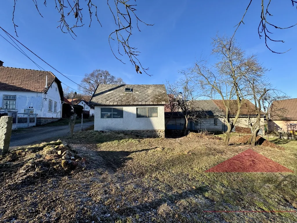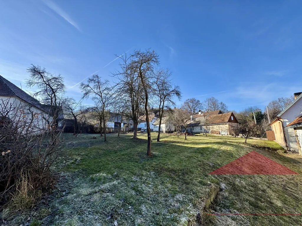Popis a poloha: obdélníkový, slunný, mírně svažitý pozemek s ovocnými stromy, ležící ve velmi klidné původní části obce. Zděná garáž (není zapsaná v KN) v rohu u cesty = ideální zázemí pro stavbu.