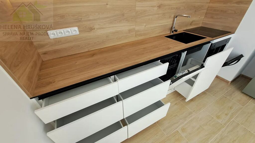 Vybavení: moderní kuchyňská linka se všemi elektrospotřebiči (elektrická varná deska, multifunkční trouba, myčka, filtrační digestoř, lednice s mrazákem). Velká šatní skříň s posuvnými dveřmi, podlahy PVC, nové vnitřní dveře s kováním, podhledy s osvětlením, stropní světla, v oknech žaluzie. V koupelně velký sprchový kout,