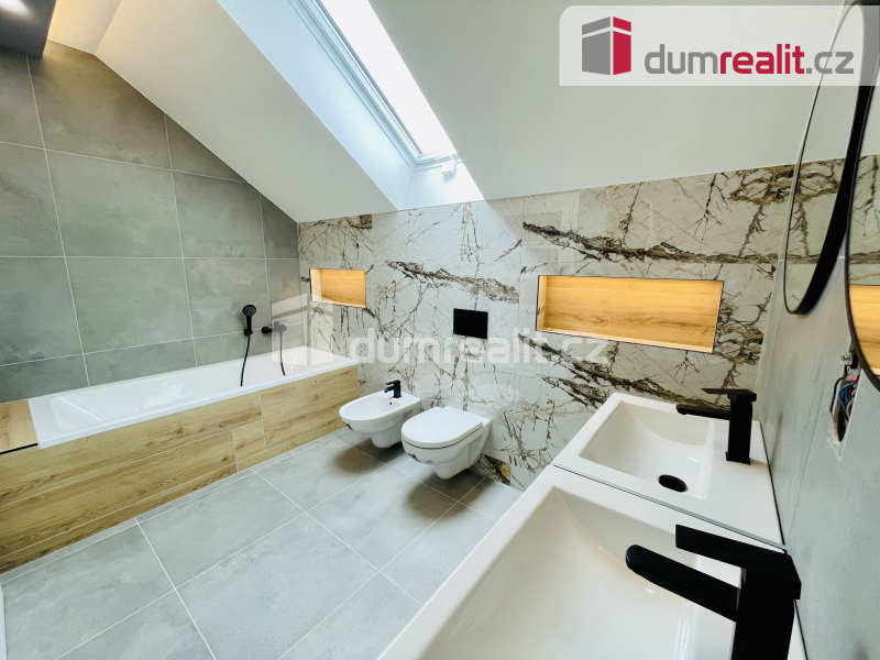 Dumrealit.cz Vám zprostředkuje exkluzivně prodej rodinného domu v Rudě u Nového Strašecí, okr. Rakovník. Jedná se o již o pátou etapu výstavby stejných patrových domů o užitné ploše 160 m², dispozici 5+KK+šatna a tech. místnost ve velmi klidné části obce se skvělou dostupností na D6 (Praha-Karlovy Vary). V přízemí je koupelna se sprchovým koutem a WC, obytný pokoj s kuchyní a jídelnou, pracovna (ložnice pro hosty), šatna, technická místnost, sklad. V podkroví je koupelna s vanou, sprchovým koutem, WC a bidet, tři ložnice a šatna. Obvodové zdivo ze zdícího systému Porotherm tl. 300 mm a polystyrénový zateplovací systém o tl. 150 mm + kamenný obklad. Zateplení krovu z "Kanadské" stříkané izolační pěny, okna plastová izolační-trojsklo. Celoplošné podlahové vytápění a ohřev vody tepelným čerpadlem. Dům je vybaven venkovními elektrickými žaluziemi. Ve výbavě je dle ilustračního fota také veškeré sanitární vybavení v exkluzivně zpracovaných koupelnách a osvětlení. Nábytek a kuchyňská linka v ceně nejsou. Jedná se o dům, který je v sousedství s dalším totožným domem a tyto budou rozděleny na dvě jednotky. Oba domy (jednotky) jsou odděleny technickým prostorem (skladem zahradního nábytku a techniky) a každý dům (jednotka) má samostatný vchod a vjezd pro osobní vozidla a dvě parkovací stání. Z domu je vstup na dřevěnou terasu. Všechny hranice pozemků budou odděleny plotem - podezdívka a sloupky KB blok + dřevěná výplň. Také budou provedeny veškeré terénní úpravy pozemku a založen trávník a osázeny keře a okrasné rostliny. Dešťová voda je odváděna do zakopané nádrže o velikosti 5 m3 a možno jí využívat k zálivce. Dům je již kompletně dokončen a bude v následujících dnech zkolaudován. Prohlídka možná po domluvě. Jedná se o v pořadí o zhotovený 5 a 6 dům v lokalitě. Předchozí 4 již jsou obývány svými novými vlastníky. Ev. číslo: 653112.