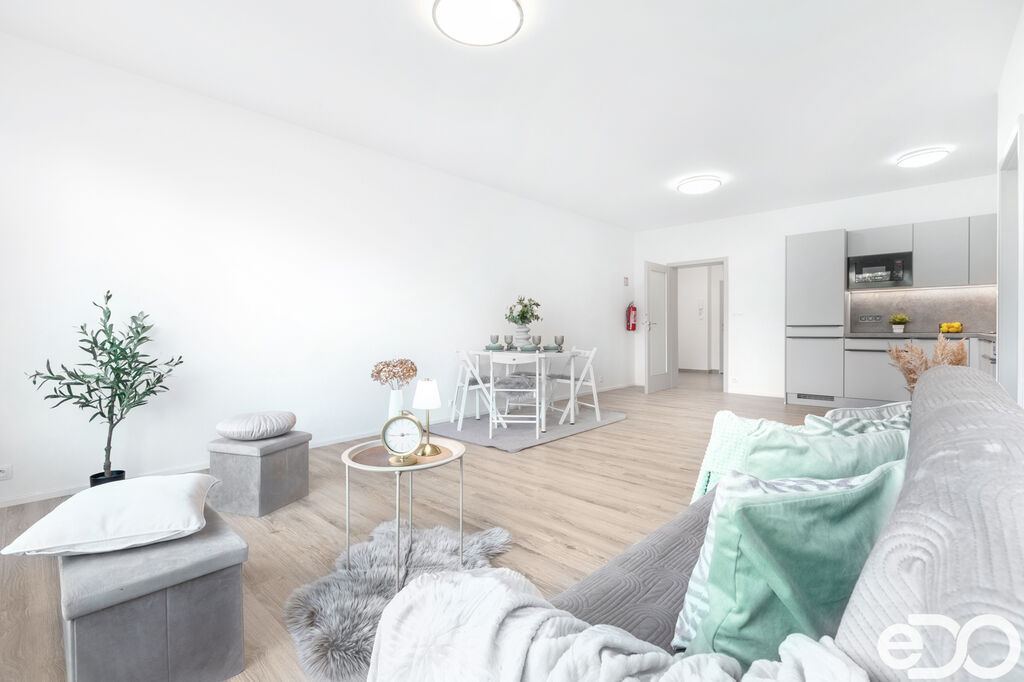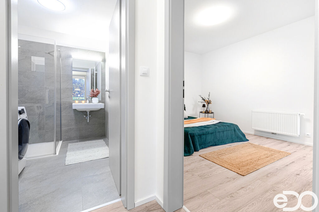 Byt se skládá z předsíně, obývacího pokoje s kuchyňským koutem, dvou samostatných ložnic (obě se vstupem na terasu), koupelny se sprchovým koutem a toaletou, další samostatnou toaletou s umyvadlem a rozměrné komory, která může sloužit jako šatna či jiný úložný prostor. Jednotka se nabízí nezařízená nábytkem. V nové kuchyni, která je vestavěná na míru, se nachází veškeré moderní spotřebiče značky Siemens: indukční varná deska s digestoří, elektrická trouba, mikrovlnná trouba, vestavěná myčka a vestavěná lednice s mrazákem. V koupelně je umístěna kombinovaná pračka se sušičkou značky Samsung. Plastová okna a terasové dveře zajišťují dobré tepelně-izolační vlastnosti. Vytápění je centrální, plynová kotelna se nachází přímo v domě. Celou nemovitost si můžete projít v pohodlí svého domova prostřednictvím virtuální prohlídky, která je součástí propagace.