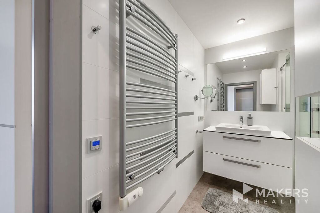 Byt vyniká nadstandardním provedením a prémiovými materiály – odhlučněné dveře Sapeli, sanitární vybavení Villeroy & Boch, klimatizace, podlahové vytápění v koupelně, klimatizační jednotka a radiátory s chytrým dálkovým ovládáním přes aplikaci.
