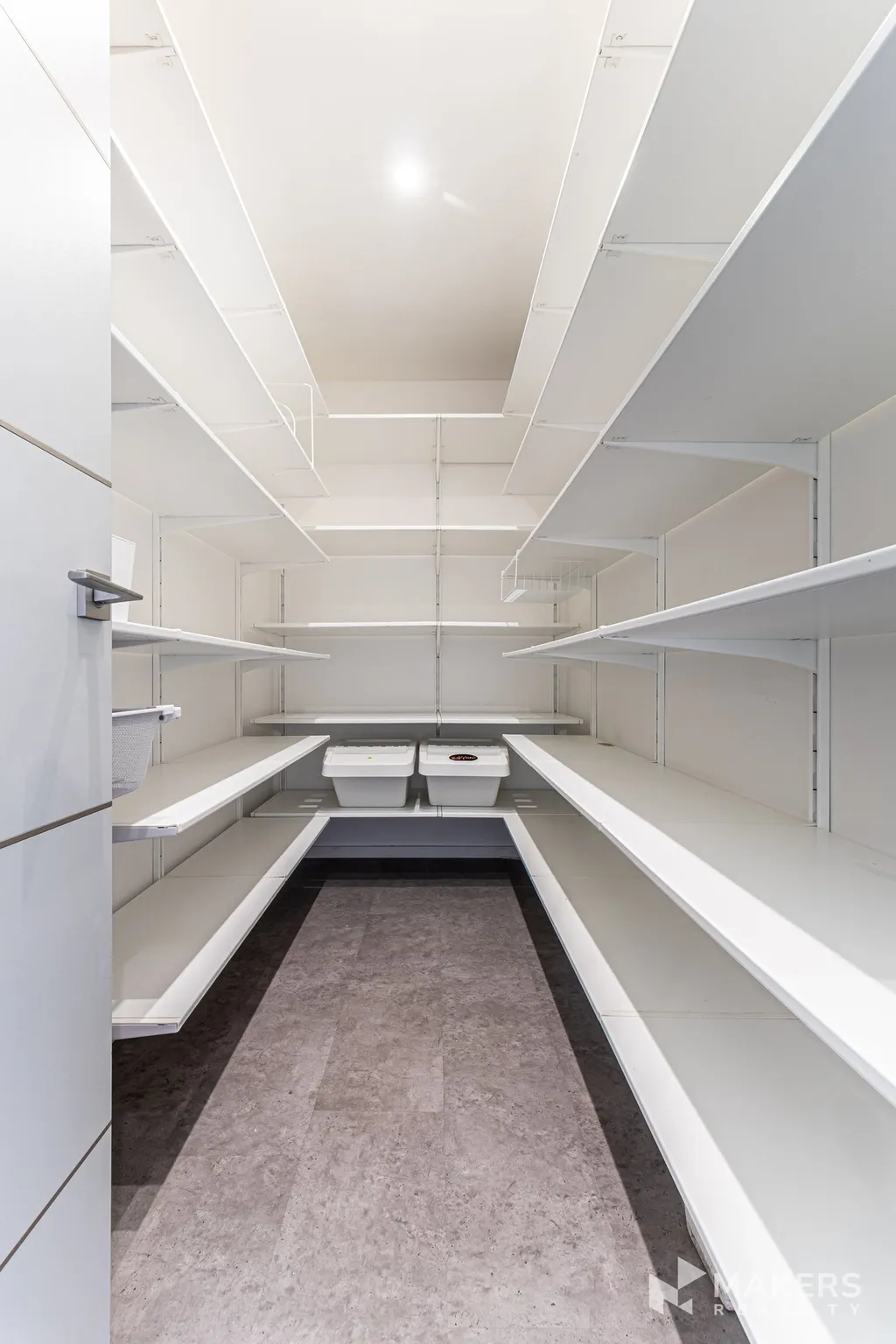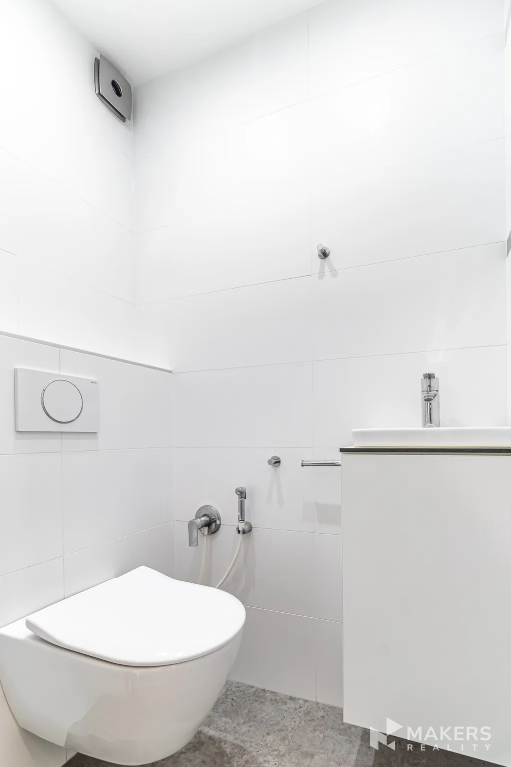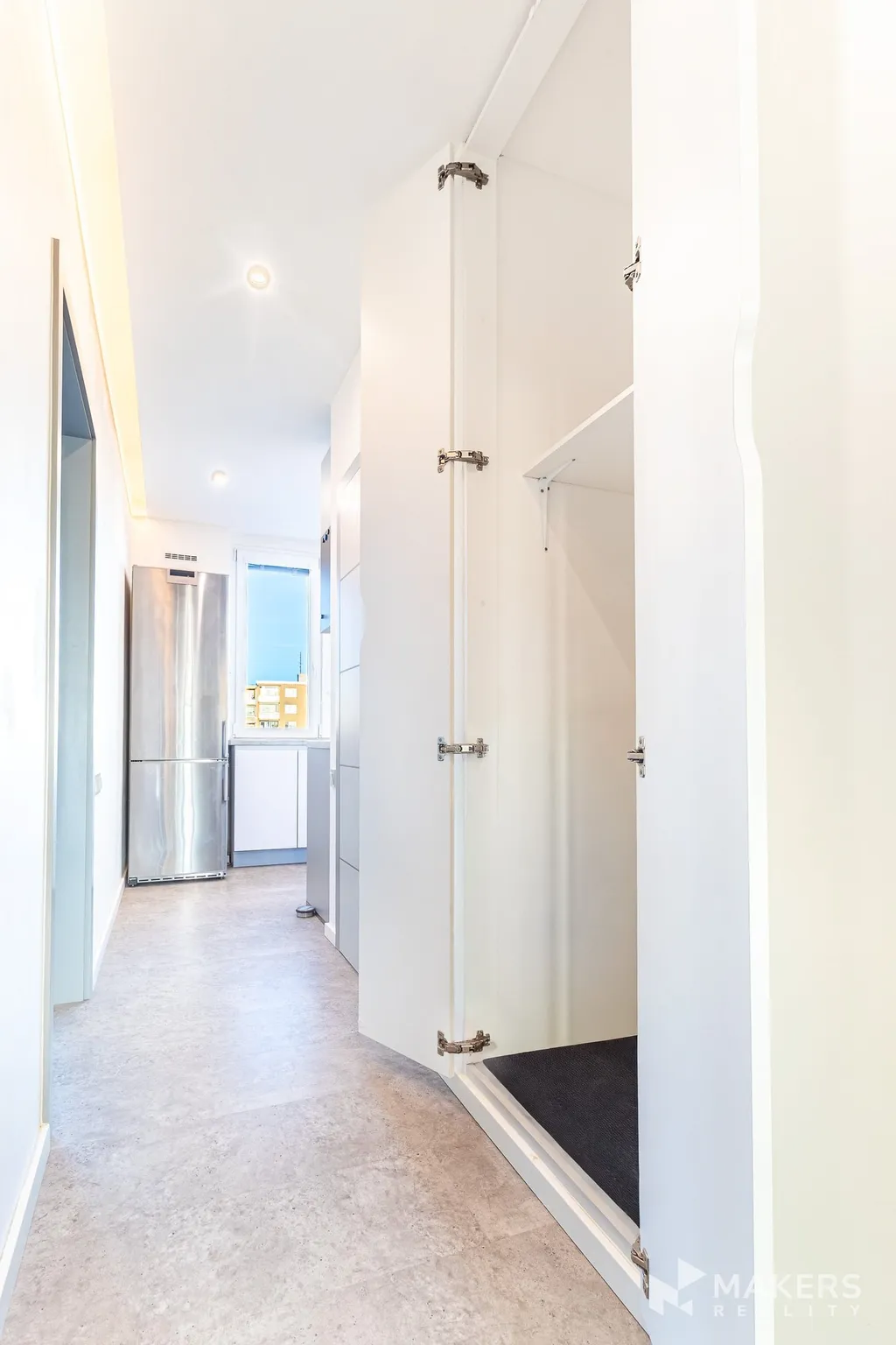 Samostatná kuchyně je plně vybavena lakovanou kuchyňskou linkou a vestavnými spotřebiči značky Whirlpool včetně myčky nádobí. K dispozici je prostorná koupelna, oddělené WC, nadstandardně velká komora a množství praktických úložných řešení.