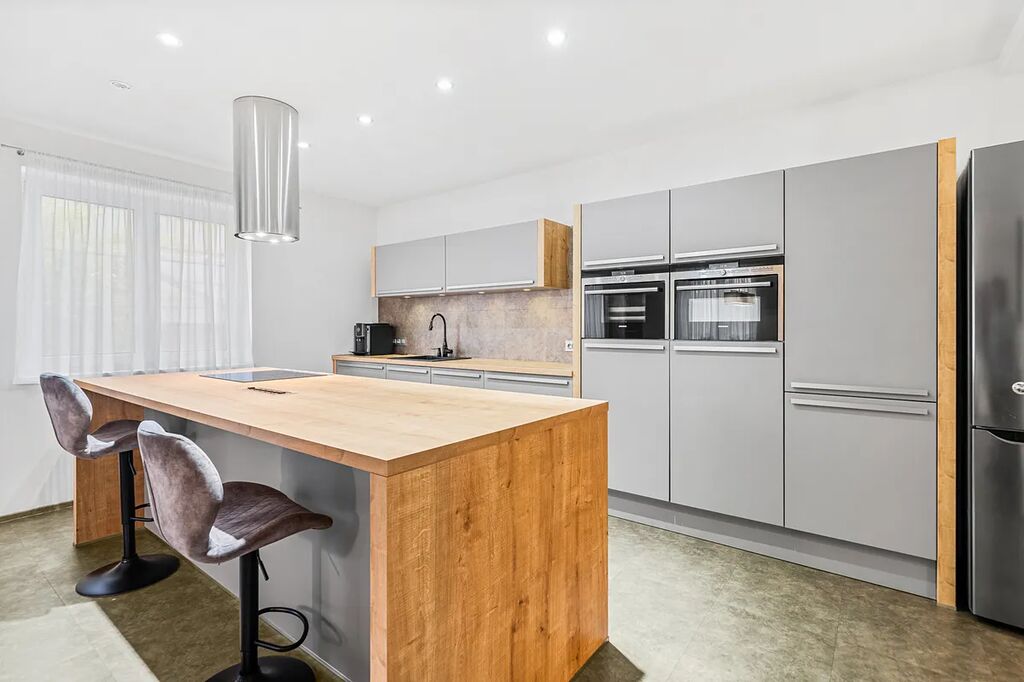 Patrový dům o zastavěné ploše 148 m2 a celkové užitné ploše cca 230 m2 prošel kompletní a velmi zdařilou a promyšlenou rekonstrukcí (kuchyně na míru vč. vestavných spotřebičů, nové koupelny, podlahové vytápění…).