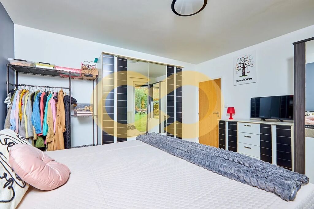 V přízemí najdete ložnici a dětský pokoj, oba s přímým vstupem na zahradu. Ranní káva na trávě? Děti běžící rovnou ven? Tady je to realita. K tomu nechybí ani koupelna a praktická spíž u kuchyně.