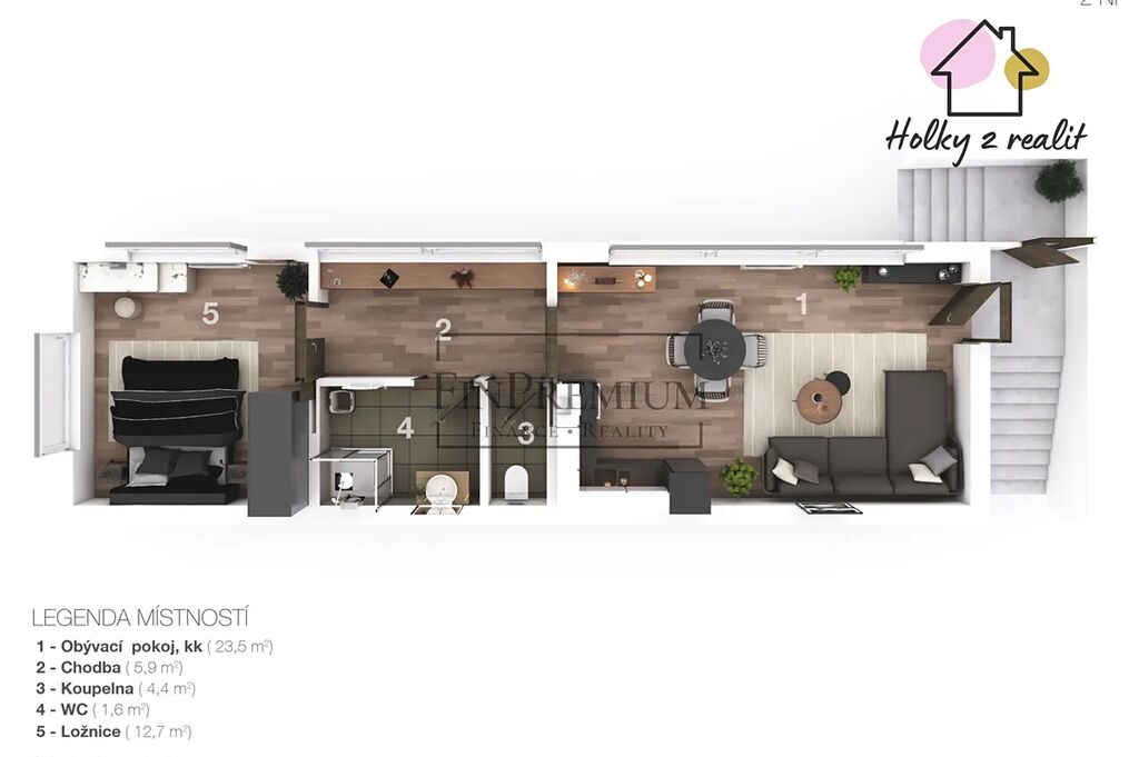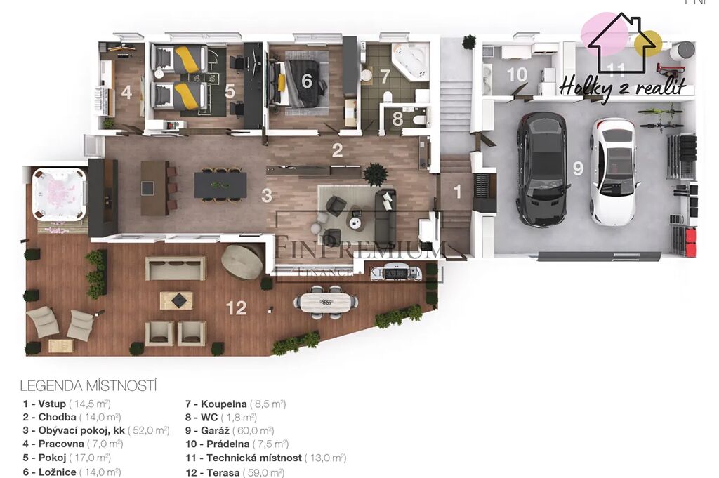 Z domu je rovněž přímý vstup do velké garáže o ploše 60 m², vhodné pro parkování více vozů i další úložné prostory. Celý objekt je umístěn na pozemku o velikosti 847 m².