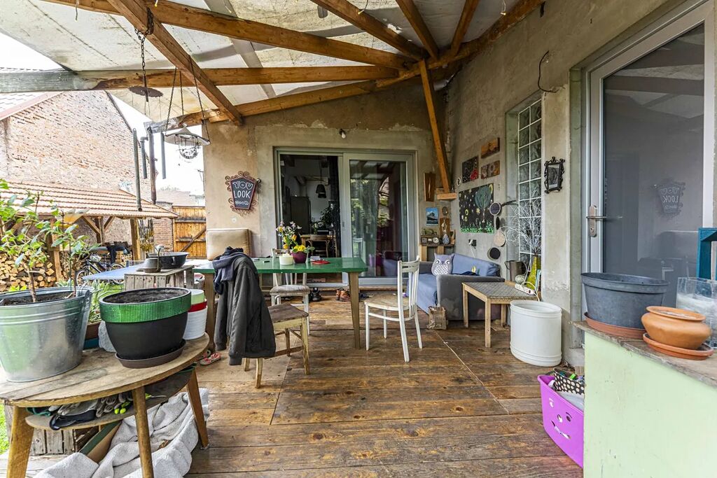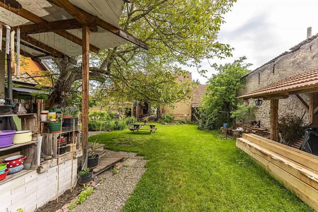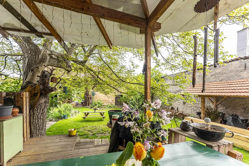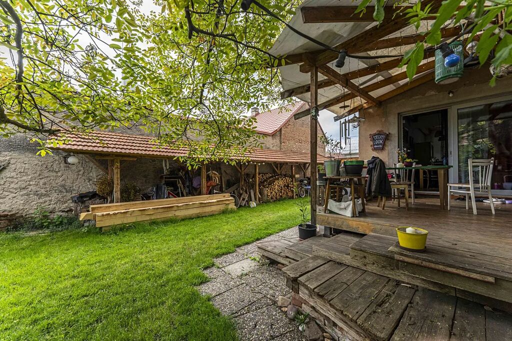 Na nádvoří domu se nachází zahrádka, které dominuje již zmíněný vzrostlý ořech. Je zde dodstatek prostoru, pro pěstování zeleniny, okrasných rostlin a i vyžití pro děti. Dále se zde nachází velkorysý přístřešek. Kolem zahrady se nachází obvodové zdi sousedních domů a stodoly, Na zahradě je rovněž studna.