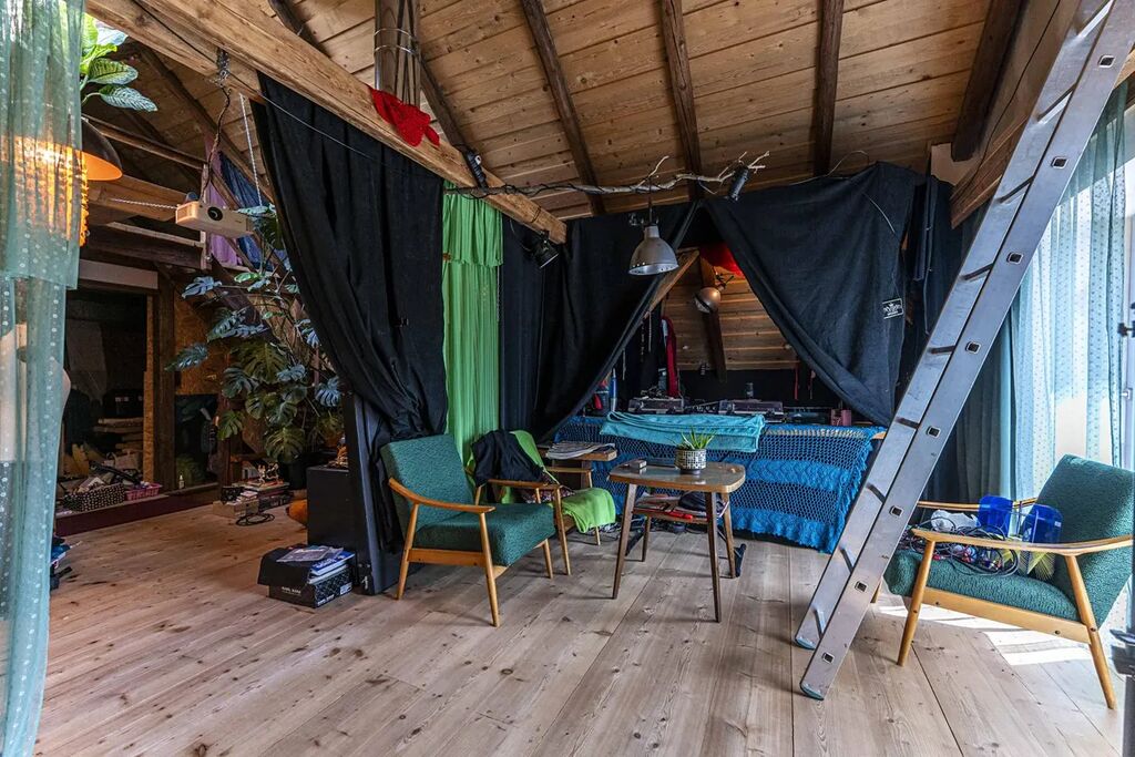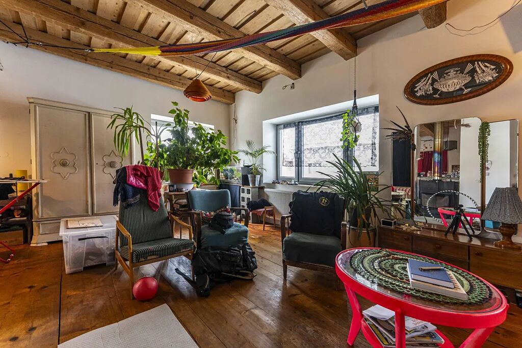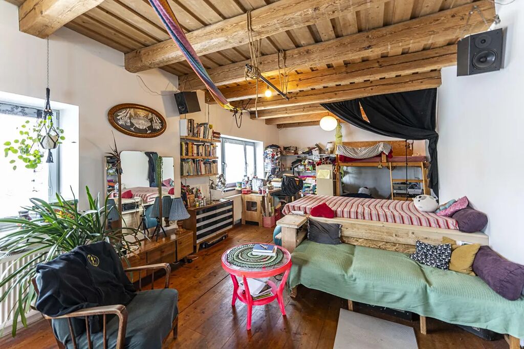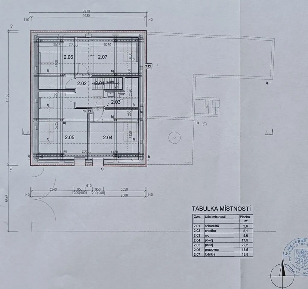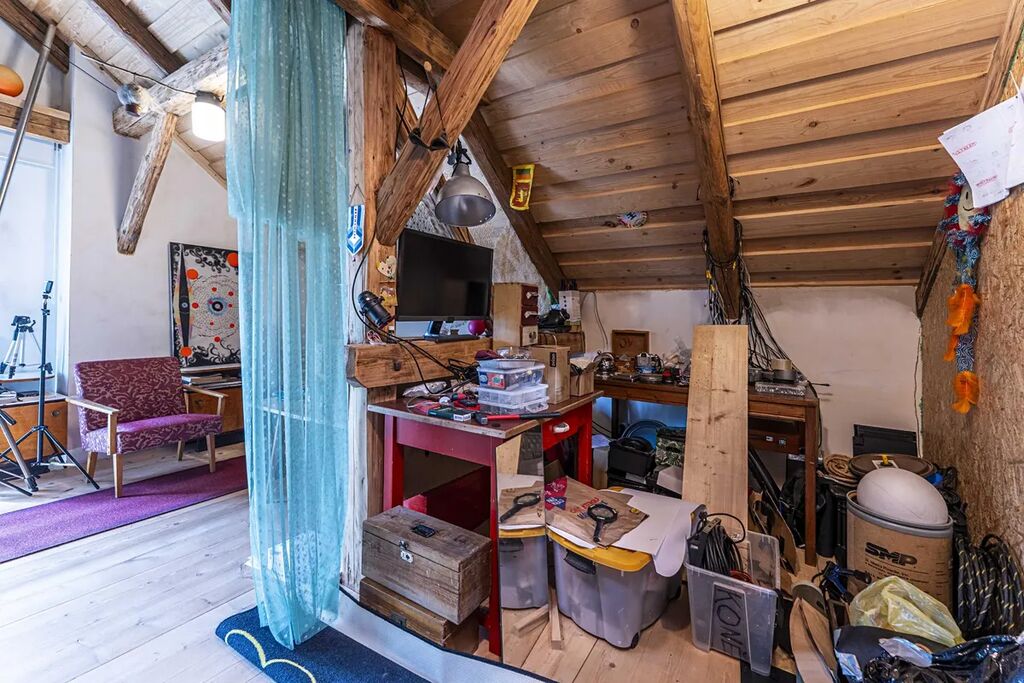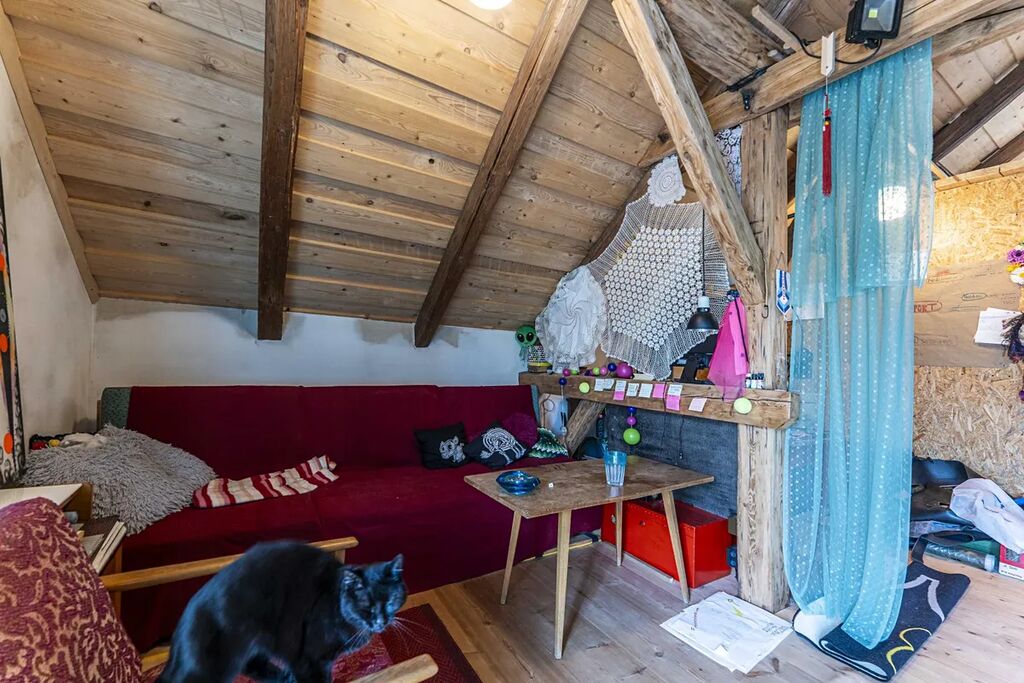 - v patře (celkem cca 84,4 m2) , tedy v 2. NP se nachází v této chvíli otevřený prostor s vysokými stropy a možností realizace až 4 ložnic a další koupelny. Několik prvků je třeba dodělat. Krovy s přiznamými trámy, speciální efektivní střešní izolace 16 cm PU