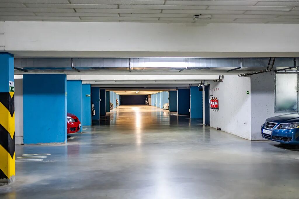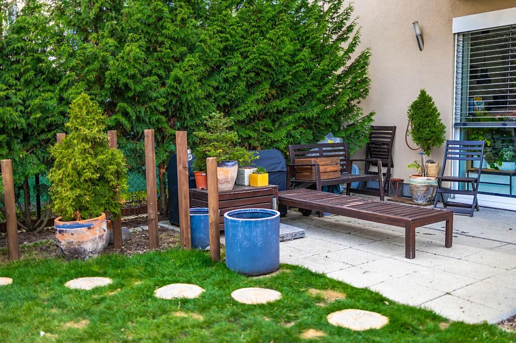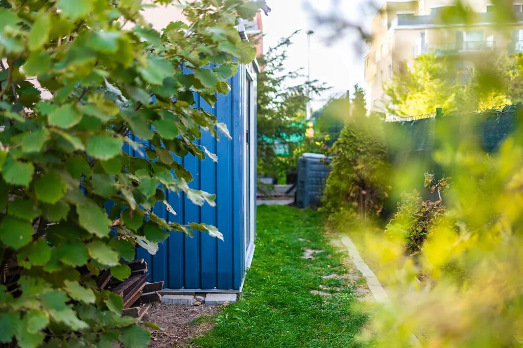 K bytu patří parkovací místo (10,65 m2) a kóje na jízdní kola (0,78 x 2,5 m – 1,95 m2) za park. místem v suterénu domu. Na zahradě je plechový domek na nářadí a kola. Terasa byla rozšířena k venkovnímu posezení.