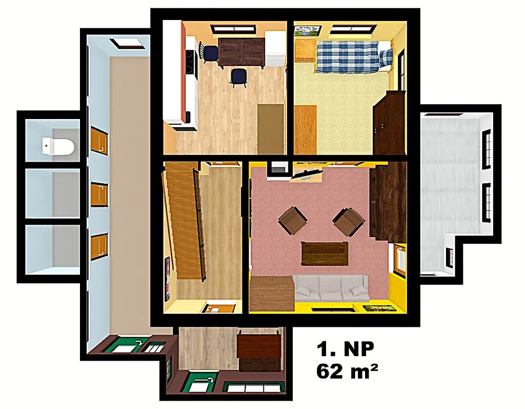 Stávající dispozice zahrnuje čtyři pokoje, kuchyni, komory a sociální zařízení, které již neodpovídá dnešním standardům. Velikou předností je pak prostorná terasa o velikosti 7,3 m2 a 18,5 m2 velký sklep.