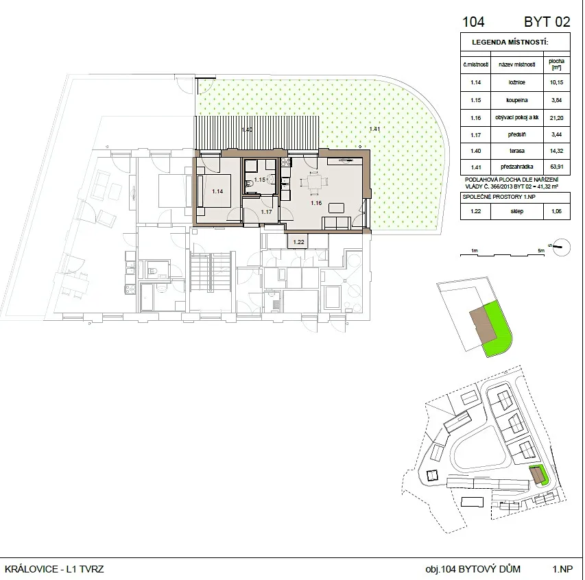 Ve výhradním zastoupení vlastníka nemovitosti vám nabízím k dlouhodobému pronájmu nový a moderní byt (41.3 m2) s terasou (14.2 m2) a vlastní předzahrádkou o ploše 63.91 m2, který se nachází v 1. nadzemním podlaží rezidenčního bytového domu v areálu projektu Nové Královice. Byt je vybaven kuchyňskou linkou se sklokeramickou indukční deskou a el. troubou, digestoří a lednicí s mrazákem. Byly zde použity výlučně velmi kvalitní materiály a provedení je opravdu precizní. Dřevěné podlahy, velkoformátová dlažba, hliníková okna s izolačními trojskly, předokenní žaluzie atd. K bytu dále náleží sklep a vlastní parkovací stání u domu - zahrnuto v ceně. Projekt se nachází v městské části Praha-Královice, která si zachovala původní vesnický ráz, ale současně je velmi dobře propojena s centrem města. Obec tak představuje klidnější a čistší variantu městského života. Přímo v Královicích naleznete množství sportovního vyžití i možností pro trávení volného času: tenisové kurty, fotbalové hřiště, přírodní park v údolí Rokytky, přírodní koupaliště Markéta, turistickou trasu i síť cyklostezek napojených na trasy vedoucí do Prahy, do Běchovic atd. V sousedním areálu zrekonstruované historické tvrze najdete např. i vyhlášenou restauraci Markéta. Jestliže hledáte lokalitu zrozenou k nalezení klidu a zároveň v místě plné občanské vybavenosti, jste v Královicích správně. Pronajímatel požaduje vratnou kauci ve výši 50.000 Kč, odměna RK 1 nájemné + DPH. Doporučuji vám osobní prohlídku. Byt je ihned k nastěhování.