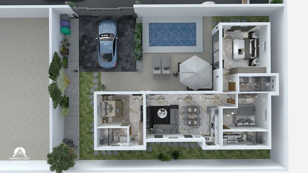 Soukromý bazén a parkovací místo dotváří komfortní a bezstarostný životní styl, který si budete moci naplno užívat.