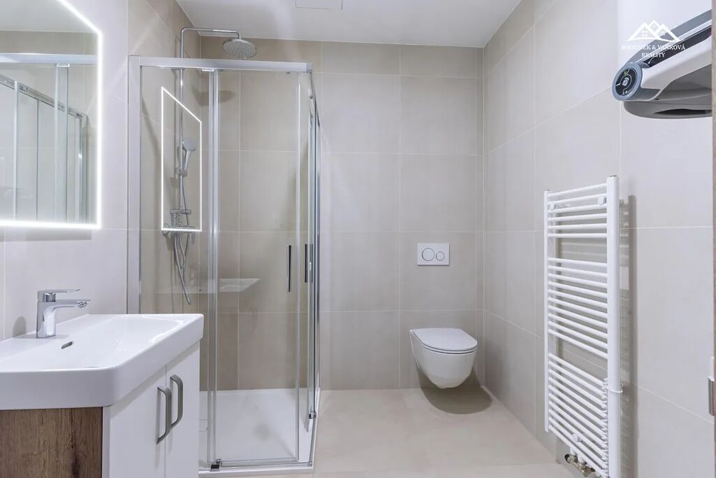 Byt je částečně vybavený kuchyňskou linkou s indukční varnou deskou, myčkou nádobí, lednicí.