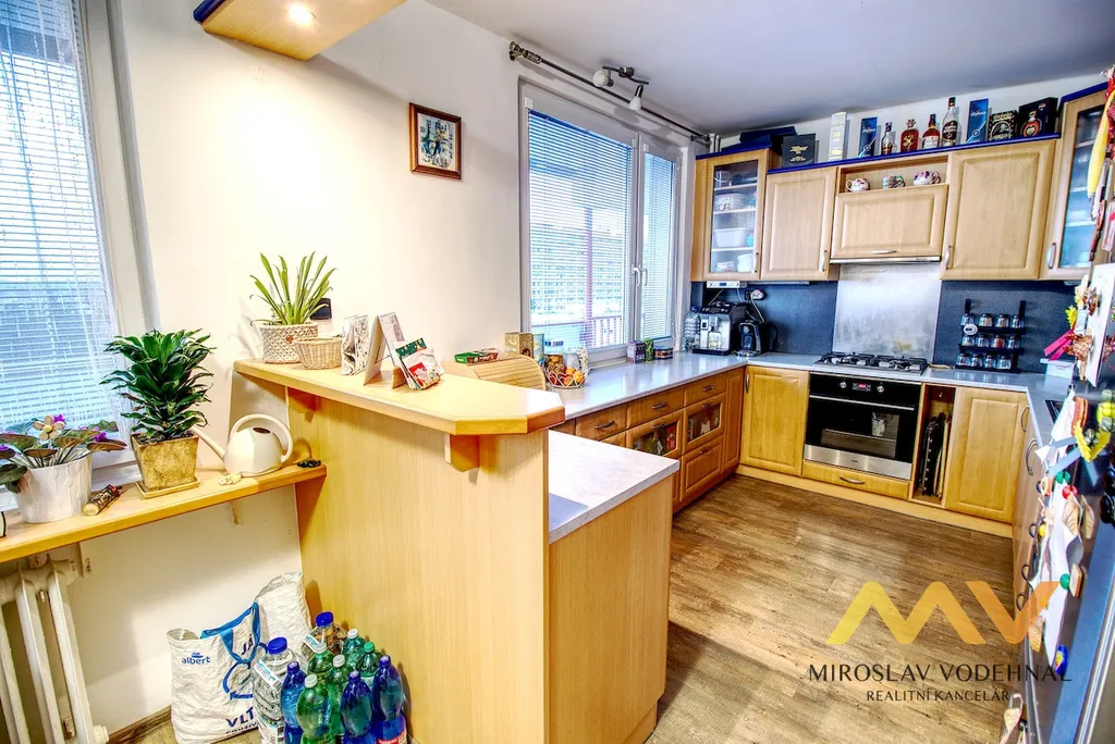 Současná dispozice vznikla úpravou původního bytu 4+1 a nabízí moderní řešení s kuchyní ve tvaru U vybavenou spotřebiči, která je propojena s prostorným jídelním koutem využitelným i jako menší obývací prostor. Z centrální předsíně s na míru vyrobenými úložnými prvky je vstup do obývacího pokoje se vstupem na rozměrnou lodžii s příjemným výhledem do okolí, dále do dětského pokoje a ložnice, které jsou vybaveny vestavěnými skříněmi. Koupelna se zděným jádrem nabízí komfort vany i sprchového koutu, toaleta je samostatná. Součástí bytu je také praktická komora s regály a v suterénu umístěná sklepní kóje o velikosti 3 m², v domě je navíc společná kolárna.