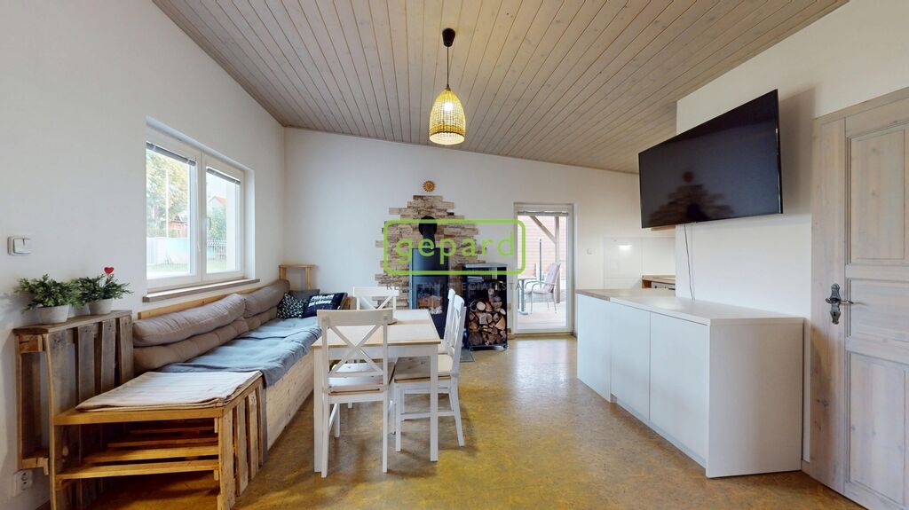 Dům s užitnou plochou 57 m² stojí na rovinatém pozemku o velikosti 450 m². Dispozičně je řešen velmi prakticky – obývací pokoj s kuchyňským koutem, ze kterého vede francouzské okno na terasu, dále ložnice s vestavěnou skříní, dětský pokoj s vestavěným druhým patrem, koupelna se sprchovým koutem a toaletou a vstupní chodba.