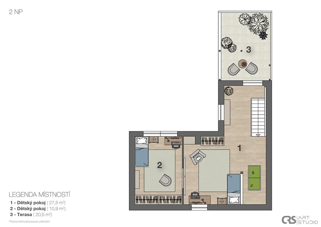 • další dva dětské pokoje v podkroví