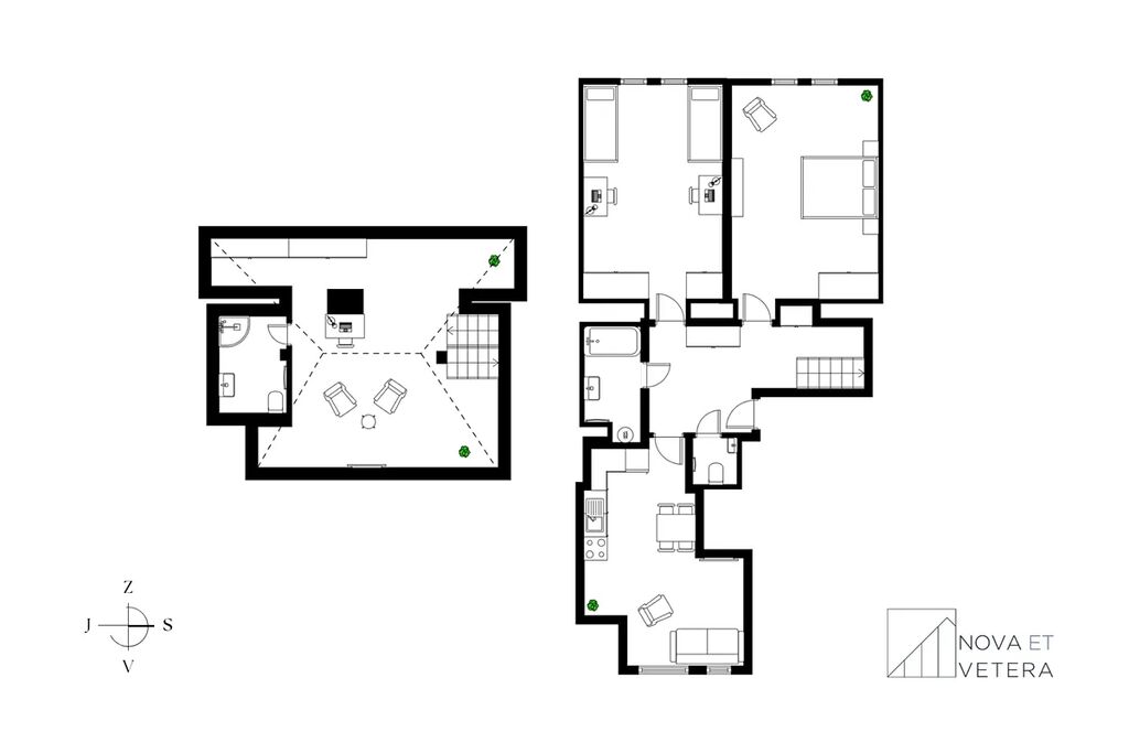Samotná jednotka prošla před pěti lety kompletní rekonstrukcí a nabízí prakticky řešený dvoupodlažní prostor. Ve spodní úrovni se nachází prostorný obývací pokoj s kuchyňským koutem, dva neprůchozí pokoje, koupelna s vanou, samostatná toaleta a vstupní chodba s úložným prostorem. V podkroví je otevřený prostor ideální jako pracovna či ateliér a druhá koupelna se sprchovým koutem a toaletou.