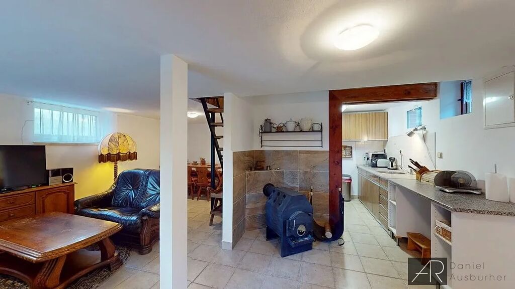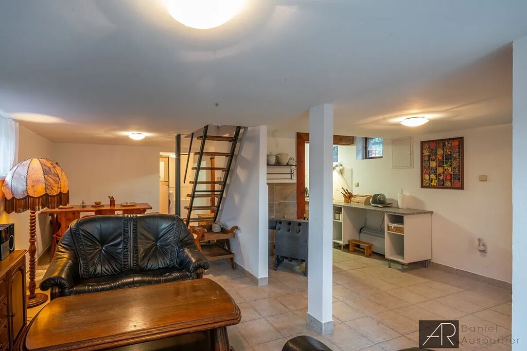 Spodní zděné podlaží, se vstupem do zahrady, tvoří obývací pokoj s kuchyňským a jídelním koutem, koupelna s toaletou a komora.