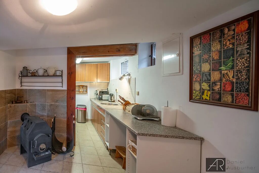 Vytápění zajišťují kamna na pevná paliva v obou podlažích, teplou vodu elektrický bojler.