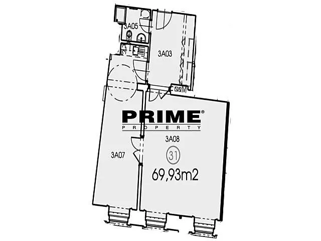 Dispozice prostor: vstupní hala, dvě samostatné místnosti (jedna větší a jedna menší, obě mají vstupy z haly a zároveň mají mezi sebou spojovací dveře; menší kancelář má kuchyňku) a koupelna (se sprchovým koutem, umyvadlem a toaletou).