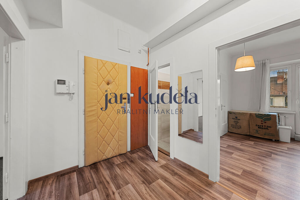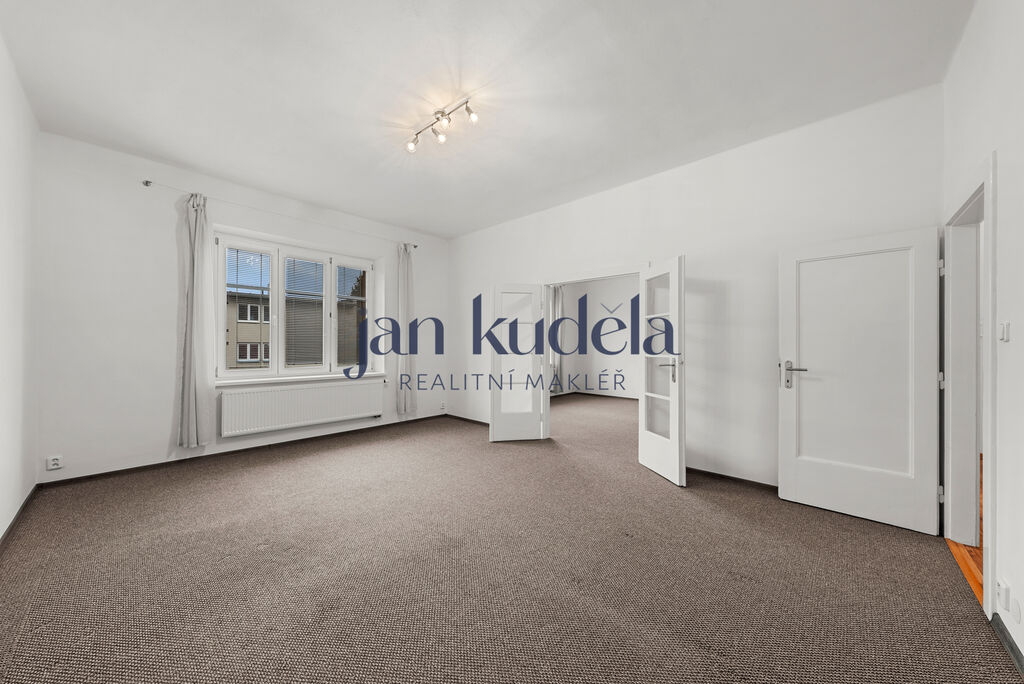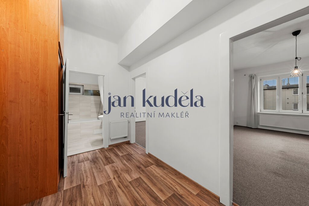 Při vstupu do bytu se nacházíte v prostorné chodbě, ze které je přístup do koupelny, samostatné toalety a kuchyně s výstupem na balkon. Z kuchyně dále vede vstup do menšího pokoje o výměře 8,7 m². Z chodby se vstupuje také do dvou velkých pokojů o velikosti 23,1 m² a 21,8 m², které jsou mezi sebou propojeny dveřmi – je tedy možné je využít jako průchozí nebo zcela oddělené.