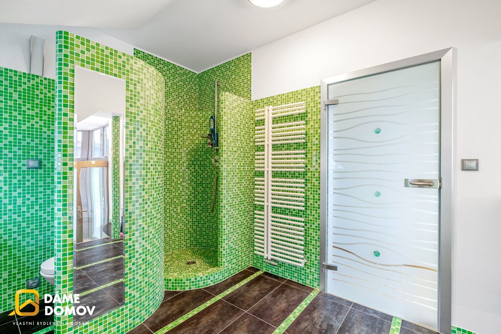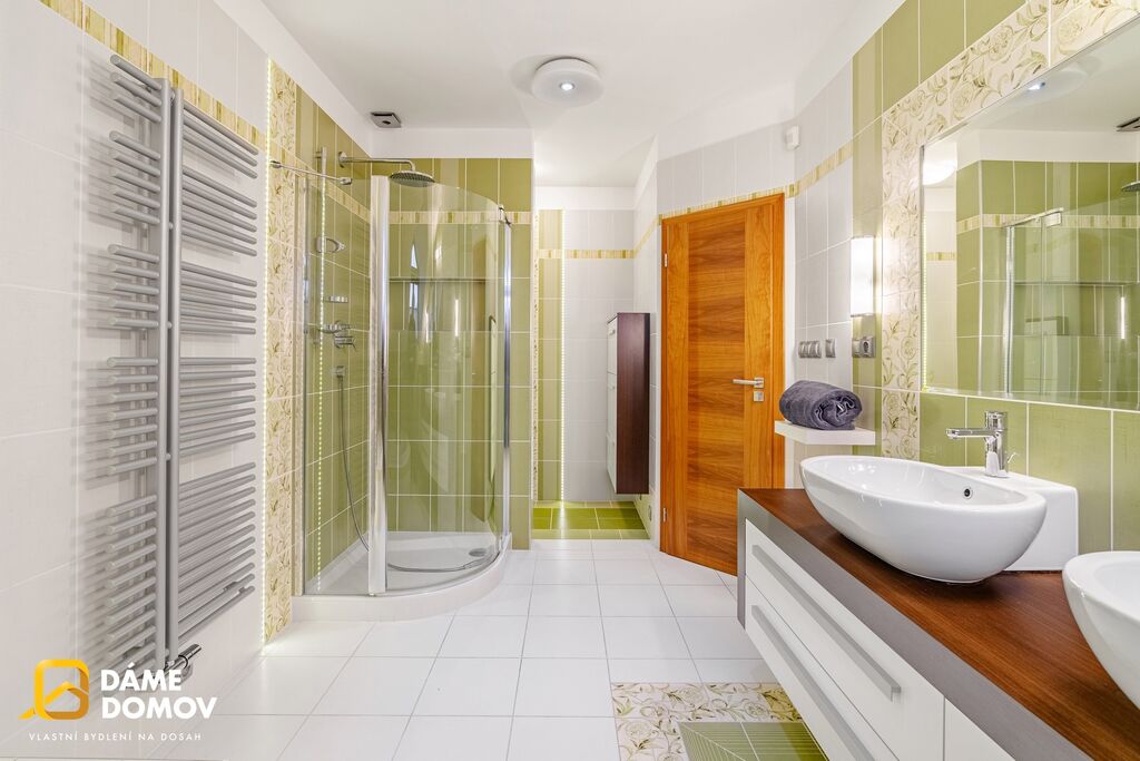 Luxusně vybavené koupelny, moderní podlahy a pečlivě zvolené materiály dotvářejí nadstandardní atmosféru celého domu.