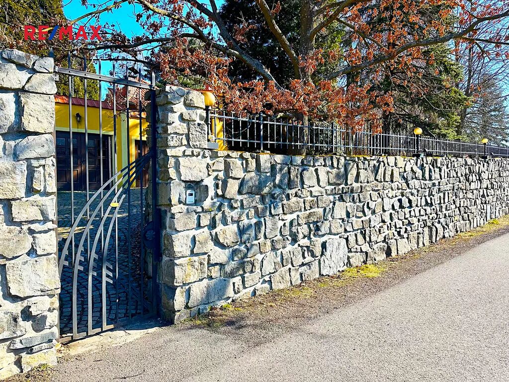 • Oplocení – Kombinace dřeva, betonových sloupků a kamenného oplocení z příjezdové strany. Masivní litinová brána.