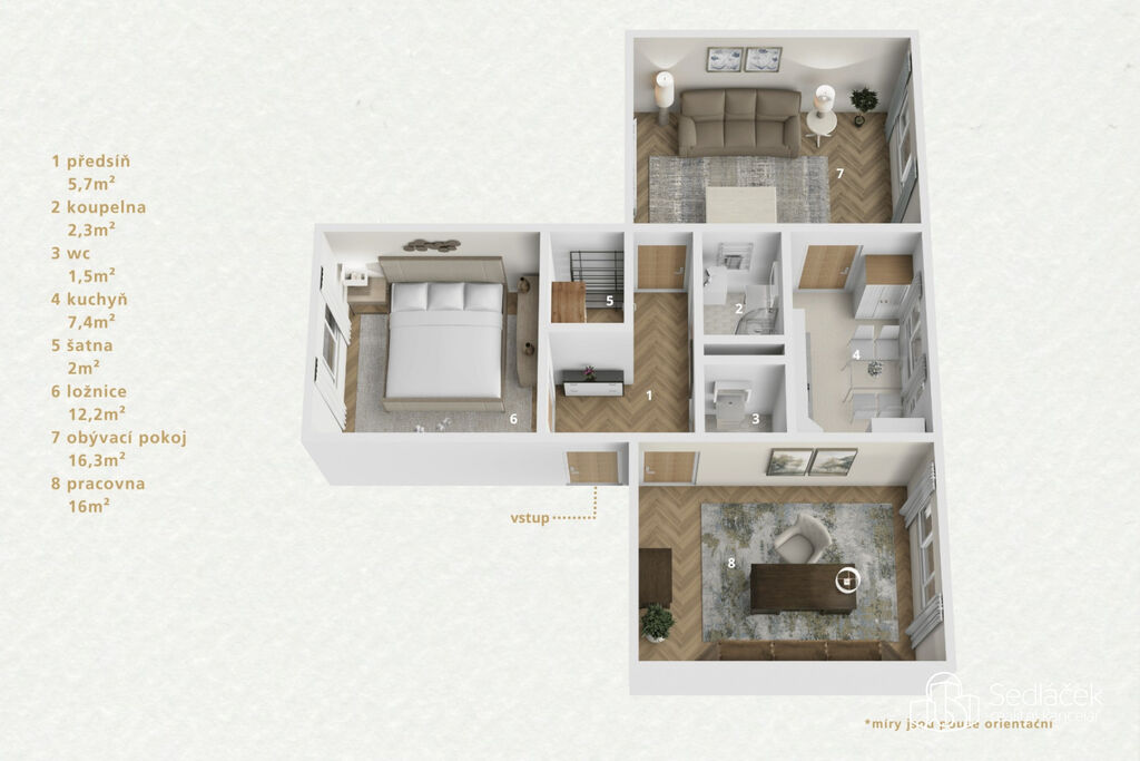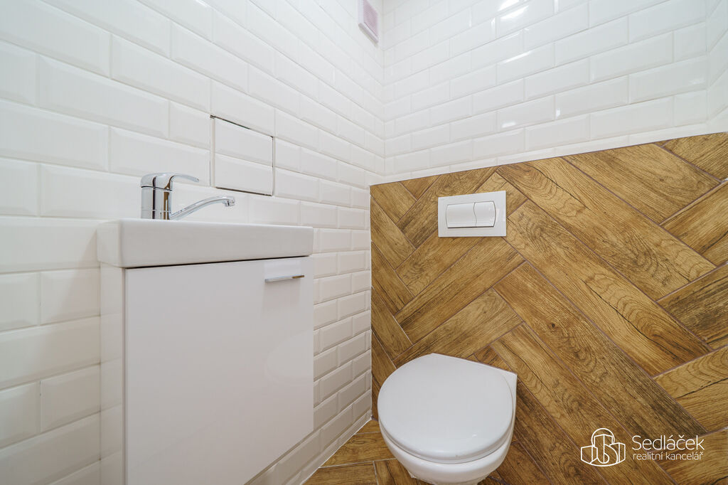 V koupelně se nachází sprchový kout, místo pro pračku, WC je řešeno samostatně. Předsíň nabízí velkou šatnu, kterou lze využít také jako komoru – skvělý bonus pro pohodlné ukládání sezónních věcí i domácích potřeb.