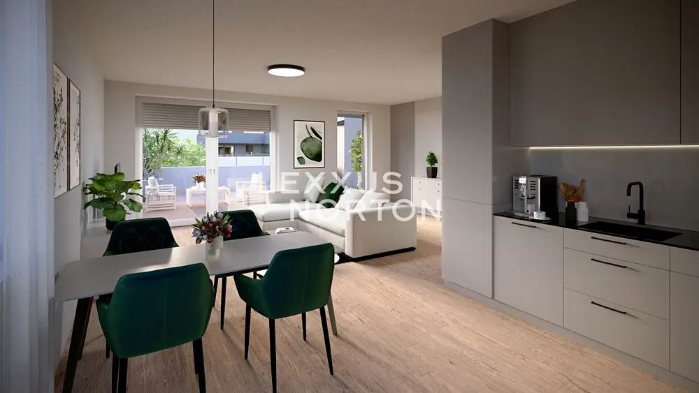 Světlý interiér bytu, který se nachází v prvním nadzemním podlaží, je tvořen vstupní chodbou (8,6 m²), prostornou ložnicí o velikosti 12,11 m² a reprezentativní obývací pokoj spojený s kuchyňským a jídelním koutem (20,25 m²), obě místnosti s přímým vstupem na nádhernou předzahrádku o rozloze 29,34 m², kde můžete relaxovat a užívat si klidu na čerstvém vzduchu. Byt je vybaven koupelnou s toaletou a vanou. V suterénu projektu naleznete místnost pro mytí kol a psů, kolárnu a kočárkárnu.