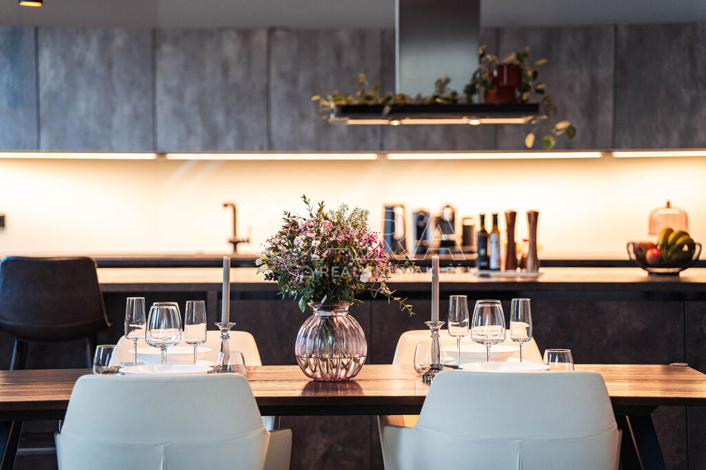 V celém bytě jsou dřevěné podlahy, vysoké stropy a nadstandardní množství vestavěných úložných prostor. Komfort zajišťuje stropní sálavé vytápění a chlazení, systém nucené výměny vzduchu, inteligentní ovládání domácnosti Loxone a vysokorychlostní optický internet.