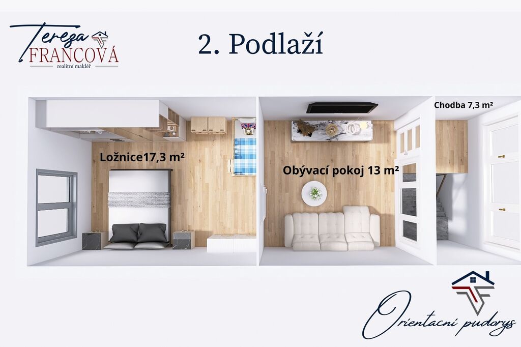 Do patra vede schodiště, kde se nachází dva pokoje, z nichž jeden je průchozí. Z hlavního pokoje se otevírá působivý výhled do okolní krajiny. Patro je vybaveno klimatizací, která zajišťuje příjemné klima i během letních dnů.