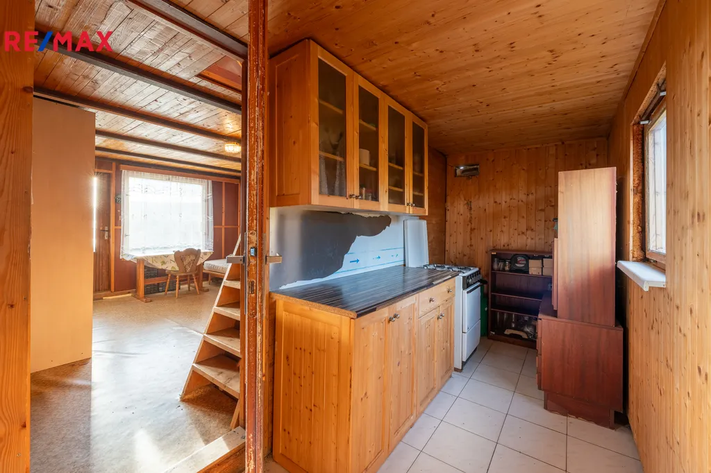 Do obytné části, která začíná v přístavbě se vchází z venkovní terasy. Je zde vstupní prostor pro odložení věcí a také kuchyňka s menší linkou a sporákem na plynovou lahev. Na podlaze je položena dlažba.