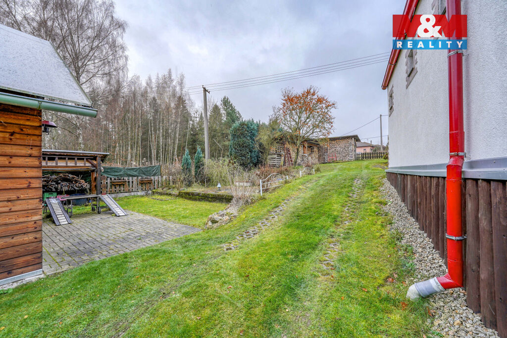 Pozemek o rozloze 1 205 m² je velmi dobře uspořádaný. Najdete zde okrasnou zahradu, garáž, dílnu, terasu, verandu, bazén i přístřešek na auto. Dům stojí jako poslední na slepé komunikaci, takže nabízí klid a soukromí, zároveň ale zůstává skvěle dostupný. Z jedné strany je rybník, z druhé les, třetí stranu tvoří louka – okolí působí přirozeně, otevřeně a příjemně. Ve městě je kompletní občanská vybavenost.
