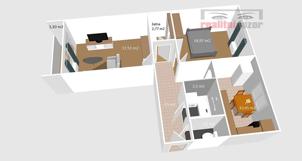 Dispozice bytu: Koupelna 2,10 m2, WC 1,15 m2, 1. Pokoj 14,97 m2, 2. Pokoj 17,51 m2, Kuchyně 10,45 m2, Předsíň 7,50 m2, Šatna 2,77 m2, Sklep 1,85 m2, lodžie 3,10 m2.