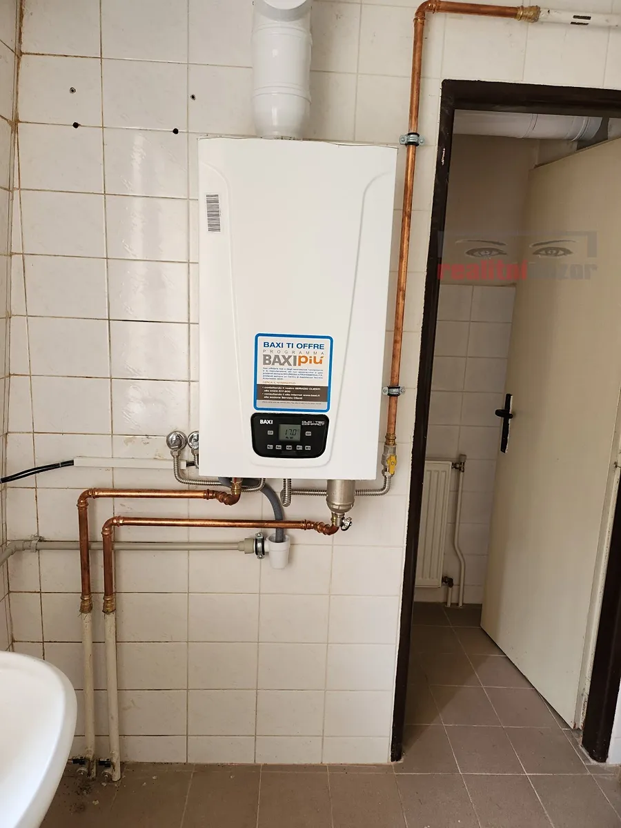 Topení je 3 novými plynovými kondenzačními kotli, vč. ohřevu TUV (byt 3NP, prostor 2NP a společný kotel pro 1NP). Topení radiátory.