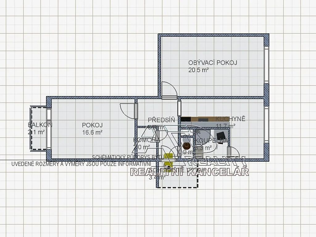 Dispozice: obývací pokoj [20,5m2], samostatná ložnice [16,5m2] s balkonem [2,5m2]. Pokoje jsou vzájemně neprůchozí. Součástí kuchyně [12,4m2] je i jídelní kout. Předsíň [5.7m2] s komorou [2m2]. Koupelna [2.5m2] a WC [1.0m2]. K dispozici je sklepní kóje v přízemí (technickém podlaží domu o výměře [1,5m2].