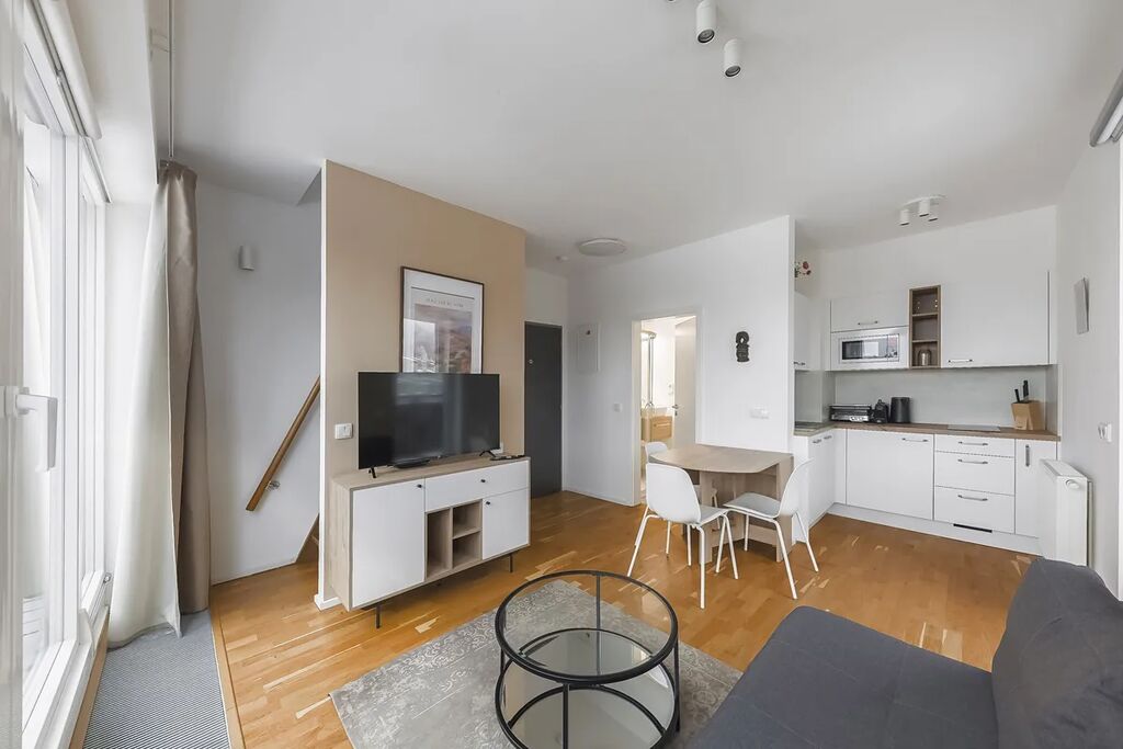 Tento elegantní mezonet o dispozici 2+kk s výměrou 40 m² je situován ve 3. a 4. nadzemním podlaží a je ideální jak pro osobní užívání, tak jako investiční příležitost.