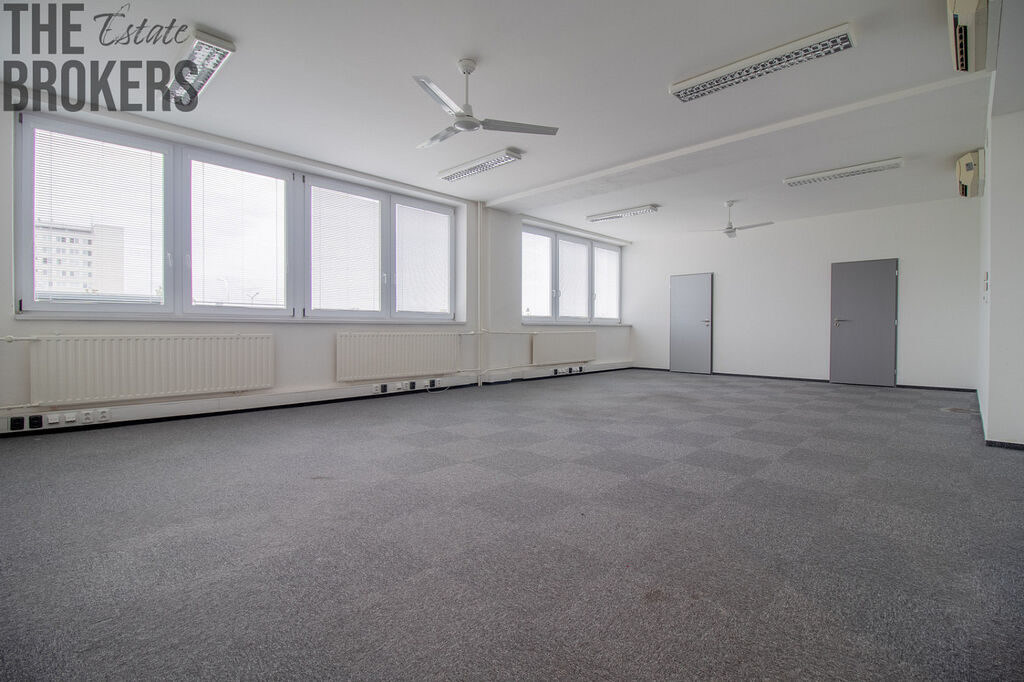 Kancelář o 59,15 m² je příjemně prosvětlená, vybavená kobercem a klimatizací a má plně bezbariérový přístup včetně výtahu. Na patře jsou k dispozici dámské i pánské toalety, ve vrchním patře navíc společná kuchyňka.
