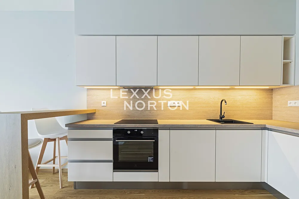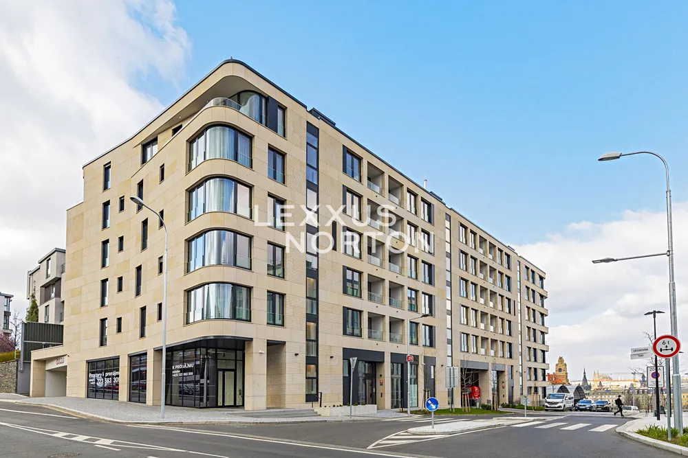V 6. nadzemním podlaží nově postaveného bytového projektu s výtahem, ostrahou a recepcí se nachází tento reprezentativní, plně zařízený byt 1+kk k pronájmu o celkové ploše 57 m2. Moderní interiér zahrnuje vstupní halu, kuchyni, vzdušný obývací pokoj s jídelním a kuchyňským koutem a přímým vstupem na balkon o velikosti 10 m2 a koupelnu. Obývací pokoj je doplněn prakticky oddělenou ložnicovou zónou. Součástí bytu jsou také garážové parkovací stání a sklep.