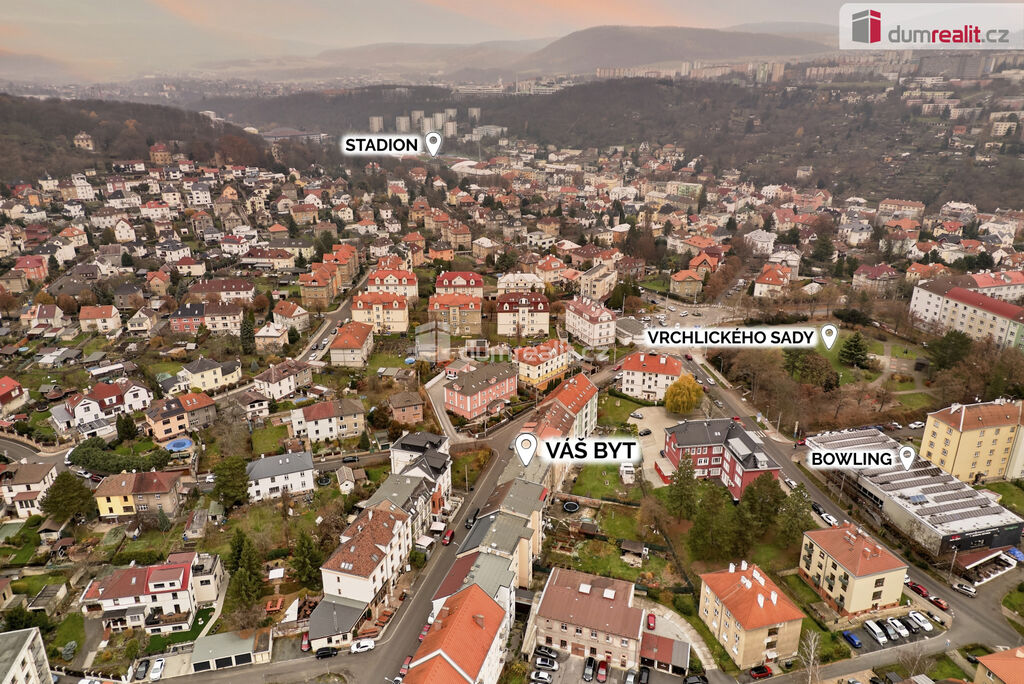 Byt se nachází v podkroví cihlového domu v ulici Klišská, která je součástí oblíbené městské části Klíše.