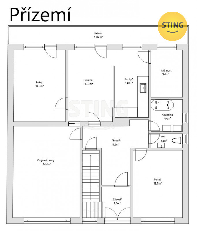 V přízemí je situováno zádveří, chodba, bytová jednotka 4+1 doplněná o hobby místnost, koupelna s vanou a samostatné WC.